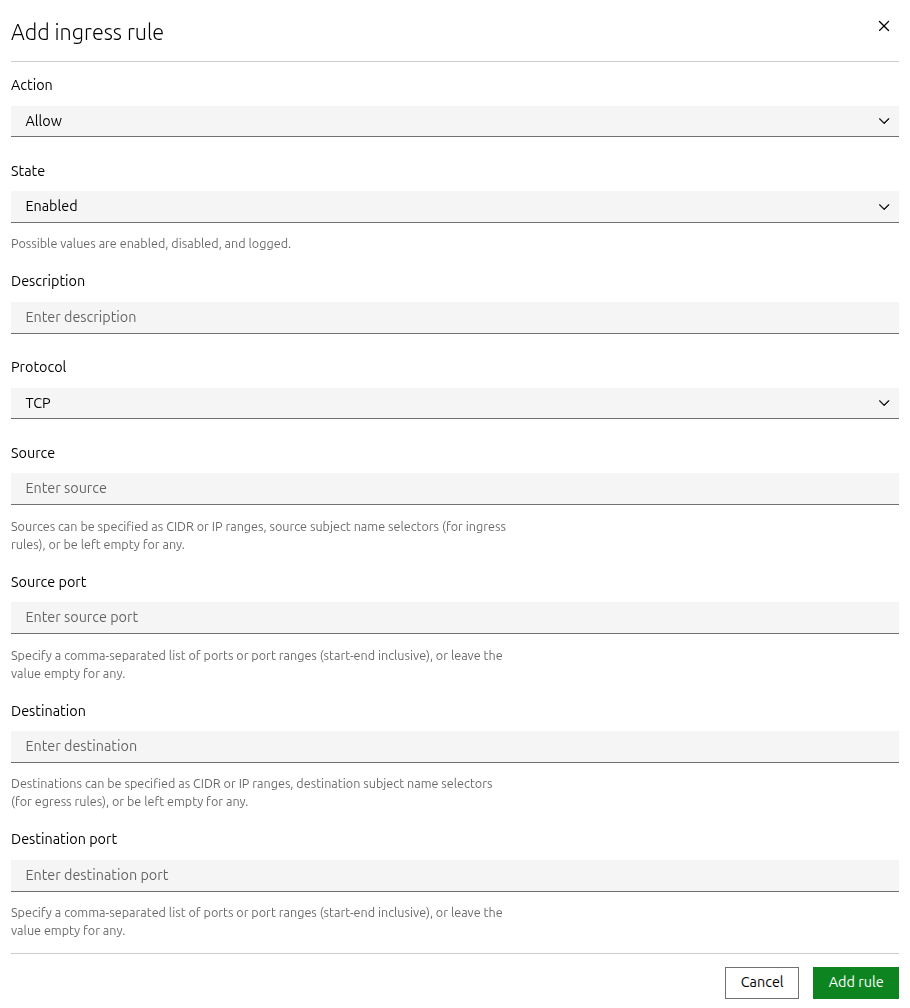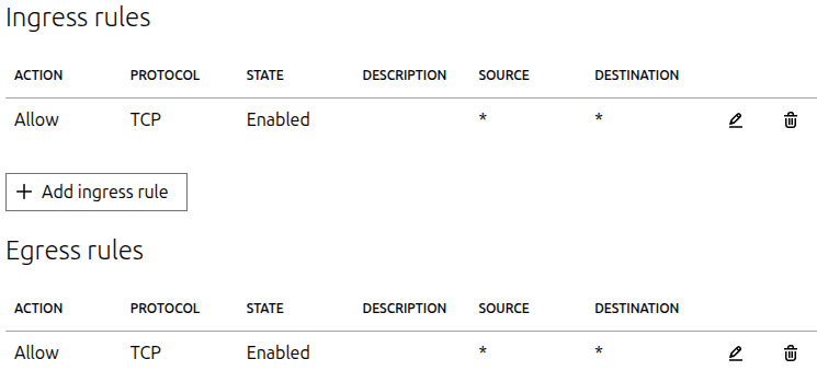 ingressandegresslists contain rules for inbound and outbound traffic. See ACL rules for details.