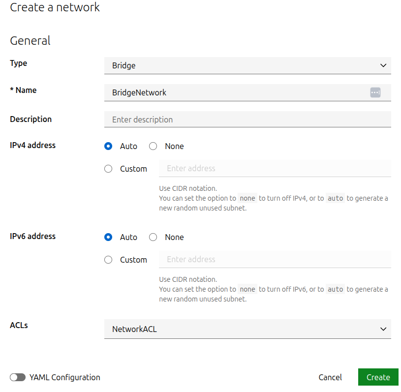 Network ACLs are available for the OVN NIC type, the OVN network and the Bridge network (with some exceptions; see Bridge limitations).