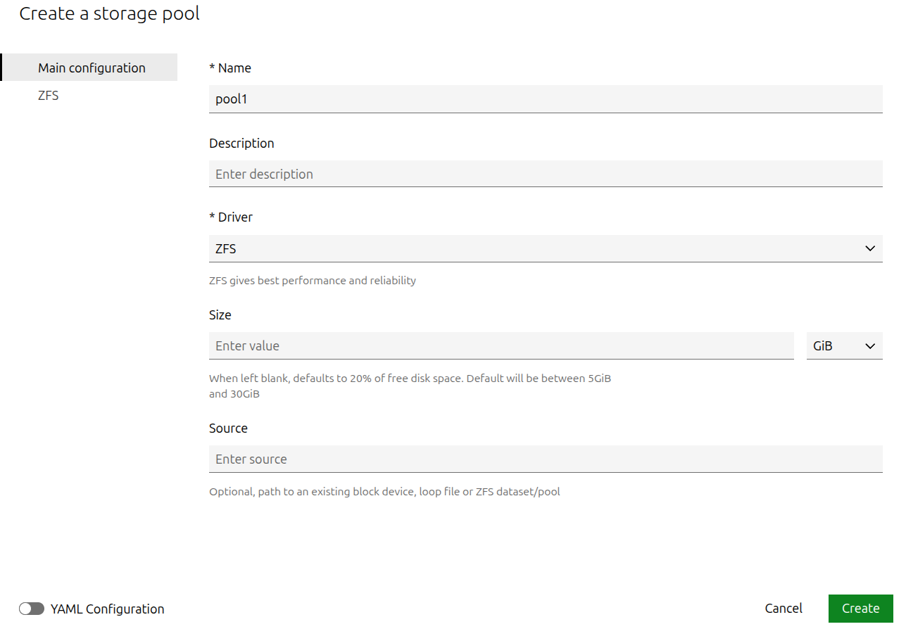 lxc storage create pool2 zfs zfs.pool_name=my-tank